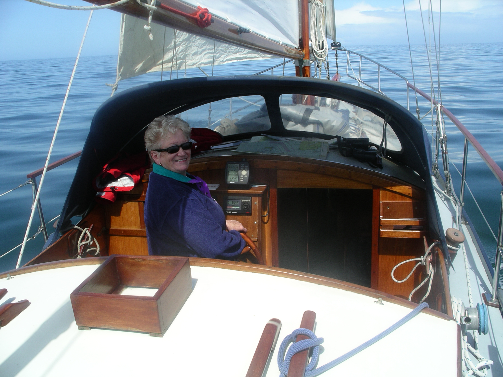 We later make a risky decision to visit the yacht haven shop where, sure enough, Linda finds a very nice Joules top. Lady Grey is treated to a new engine battery and Sandy kindly returns us to Craobh in his Volvo.